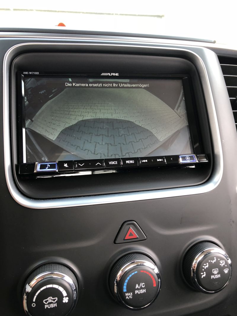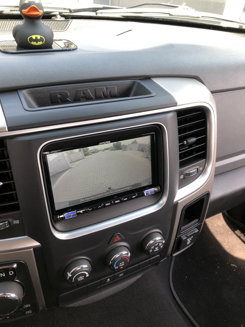 Die großen Aussenabmaße des Dodge Ram machen es sehr angenehm, eine Front- und Heckkamera zu haben, die einen großen Blickwikel abdeckt. Bei dieser Gelegenheit wurde auch das Werks-Navigationssystem, das eine altmodische Bedienbarkeit mitbringt und mit wenig Ausstattung aufwartet, gegen ein Alpine INE-W 710 ausgetauscht.