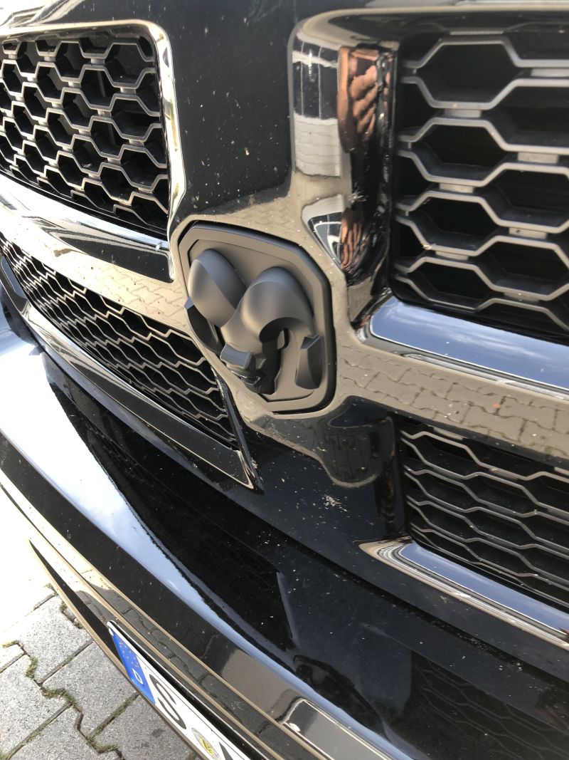 Der steile Grill des Dodge macht die Montage der Frontkamera recht einfach. Schnell ist die optimale Position gefunden. Dank des kundenseitig schwarz lackiertem Fahrzeugemblems gestaltet sich der unauffällige Einbau ebenfalls angenehm einfach. Die Kamera ist durch die Neigung nach unten gut vor Steinschlag geschützt und überblickt durch die hohe Position einen weiten Bereich.
