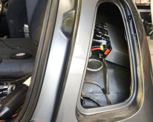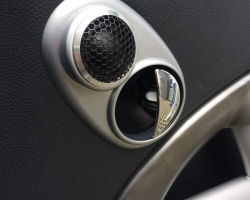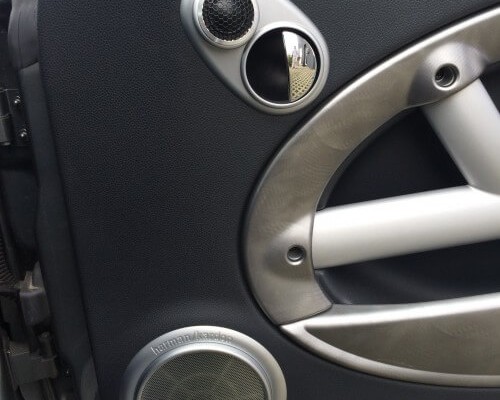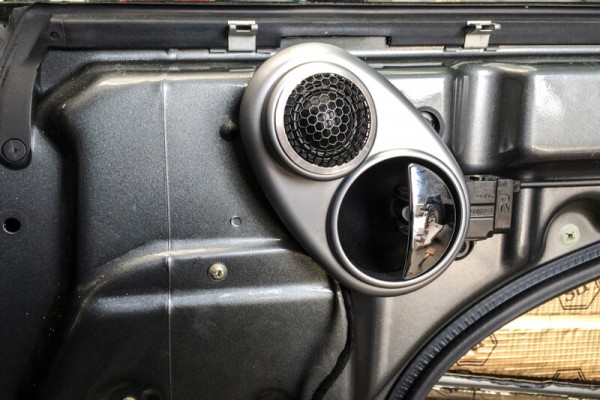 Ein Mini Cooper S bekommt eine nahezu unsichtbare aber hochwertige Klangaufwertung: Lautsprechersystem Rainbow Germanium 16-cm als Aktivvariante, angesteuert mit einer Mosconi D2-DSP-Prozessorendstufe. Am Bass spielt eine Mosconi One 120.2, die ihre Leistung an einen Aliante 10″ Subwoofer im superflachen, teppichbezogenen Gehäuse im Kofferraum liefert. Die Einbauplätze der Lautsprecher wurden optimiert und mit STP Anticor Gold 2,4mm-Dämmaterial ausgekleidet. Das sorgt für präzise und satte Bässe ohne nachzuschwingen. Aus tonalen Gründen wurde der Hochtöner sichtbar verbaut, um Schallbrechungen zu vermeiden und das Frontstaging zu verbessern.