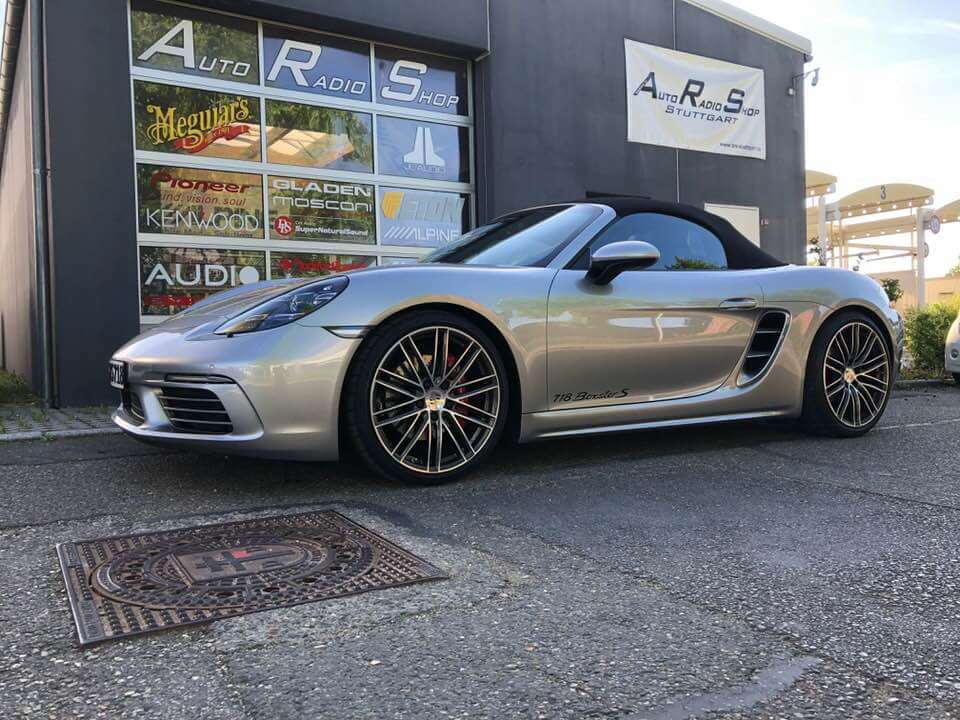 Porsche Boster 718S der neuesten Generation vor dem Auto-Radio-Shop-Ladengeschäft nach dem Hifiumbau