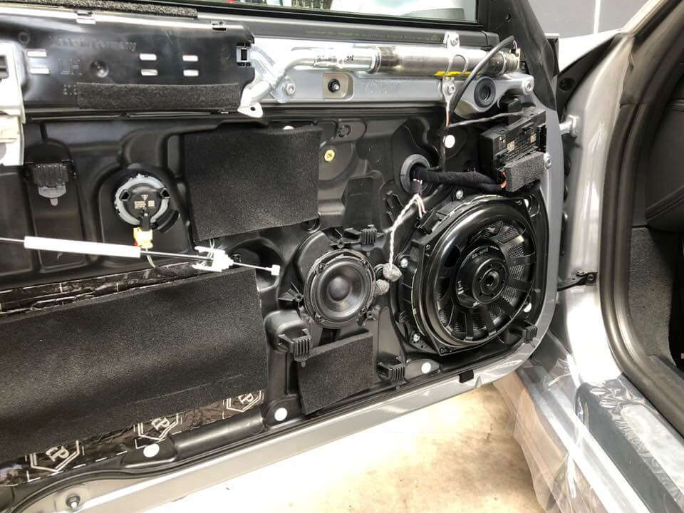 Hierzu werden die Bauteile sorgfältig gereinigt und entfettet, und je nach Flächenbeschaffenheit mit unterschiedlichen Dämmaterialien beklebt. Die Bleche und den Kunststoffträger mit selbsthaftenden STP Anticor-Dämmatten, die Kabelbäume vor- und hinter dem Aggregatenträger werden zusätzlich befestigt und stellenweise mit einem sehr flauschigen Gewebe-Isolierband umwickelt. Die Befestigungspunkte der Türverkleidung unterlegen wir, und den Spalt zwischen den Lautsprechern und dem Außengitter füllen wir mit einem wasserabweisenden Spezialschaumstoff aus, damit der Schall gebündelt wird und weniger in den Zwischenraum „entweichen“ kann.