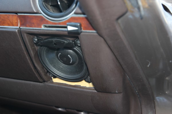 So wurde bei diesem Mercedes R107 ein hochwertiges 2-Weg-Lautsprechersystem im Aktivbetrieb, ein Fünf-Kanal-DSP-Verstärker und ein 20-cm-Subwoofer verbaut. Findet der Tiefmitteltöner Gladen Zero 100 Z-3 noch in den Werks-Lautsprecheröffnungen unter den Abdeckungen Platz, so muss der zugehörige Hochtöner akustisch besser, dennoch aber verdeckt plaziert werden. Unser Hochtöner wird von unten her in die Lüftungsdüsen des Armaturenbretts eingelassen, und verteilt seinen Klang über die Winschutzscheibe. Das bringt den Klang weiter nach oben, sodass die nach unten gerichtete Einbauposition des Mitteltöners gut kompensiert wird.